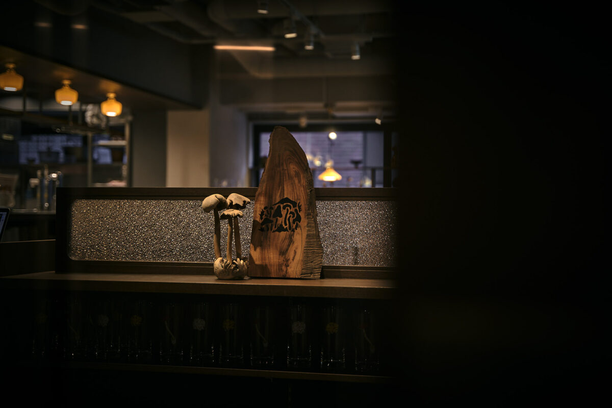 世界中で集めてきた器や調度品、お店のサインも自分で木を切り出して直接描いて作ったもの。グラスにもオリジナルの木の子グラフィックをあしらい、提供するメインのきのこ等はまるでブーケのようにこんもりと盛られ、サービスする度に、お客様を楽しませる。