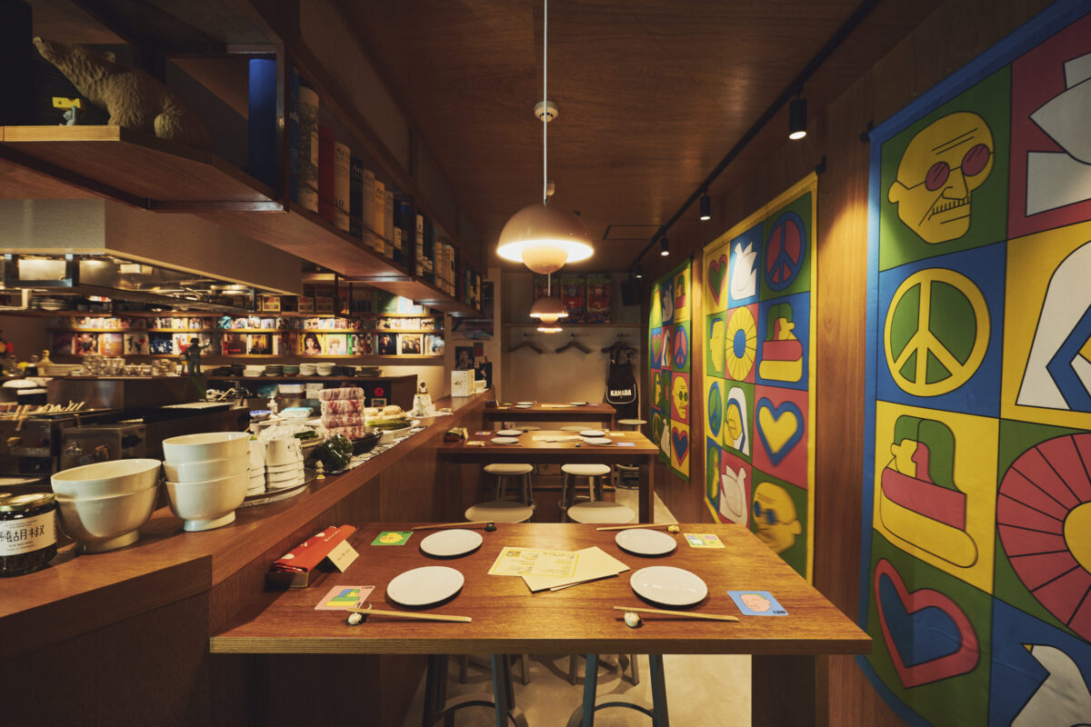 厨房を店内の中心に配置し、それを囲むようにカウンター・テーブル席を配置。 それぞれの席の床レベルが全て違っており、最大で60cm差がある。 各所に座る人の目線やスタッフとの関係性が不自然にならないよう、 使い勝手も含め各所の寸法を丁寧に調整。 ラワンベニヤや昔の建物の外壁でよく見る吹付タイルをあえて店内に使用し、少しレトロな雰囲気を演出。 オーナーにより、膨大な量のレコードや玩具、豊富な種類のお酒が各所にセンスよくディスプレイされており、空間に深みが出ている。