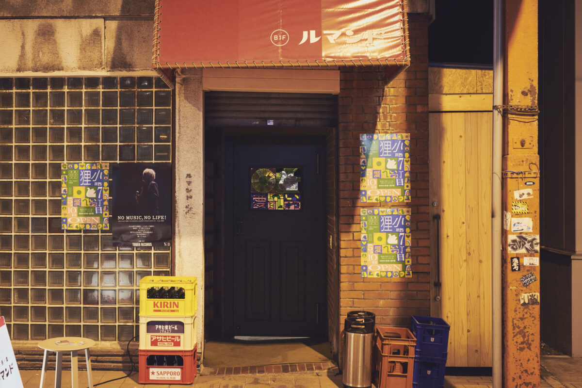 厨房を店内の中心に配置し、それを囲むようにカウンター・テーブル席を配置。 それぞれの席の床レベルが全て違っており、最大で60cm差がある。 各所に座る人の目線やスタッフとの関係性が不自然にならないよう、 使い勝手も含め各所の寸法を丁寧に調整。 ラワンベニヤや昔の建物の外壁でよく見る吹付タイルをあえて店内に使用し、少しレトロな雰囲気を演出。 オーナーにより、膨大な量のレコードや玩具、豊富な種類のお酒が各所にセンスよくディスプレイされており、 空間に深みが出ている。