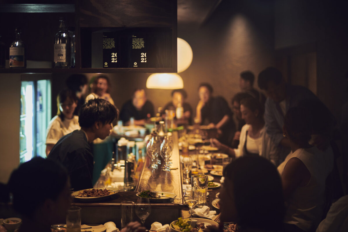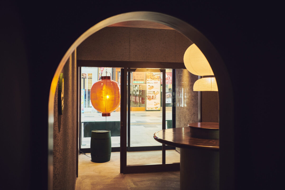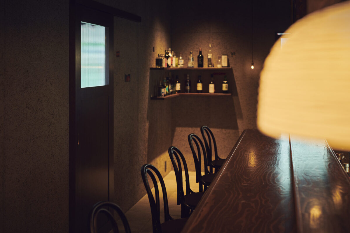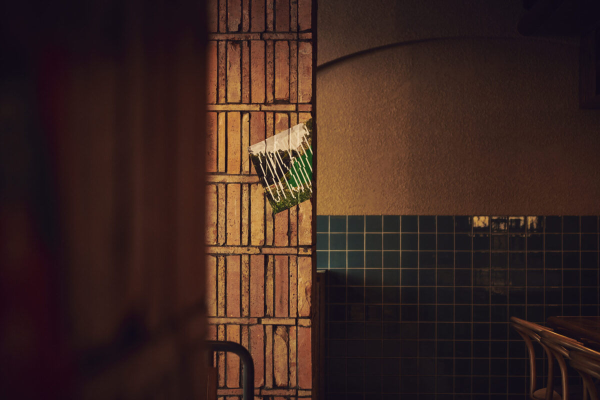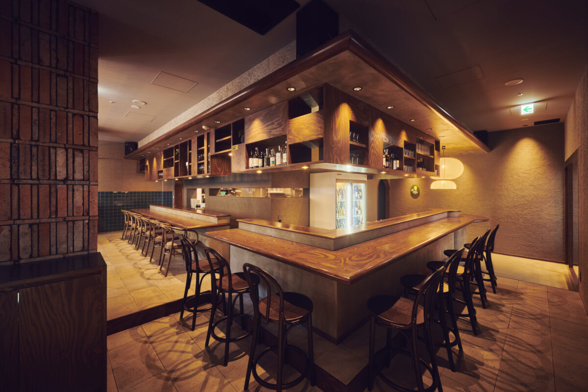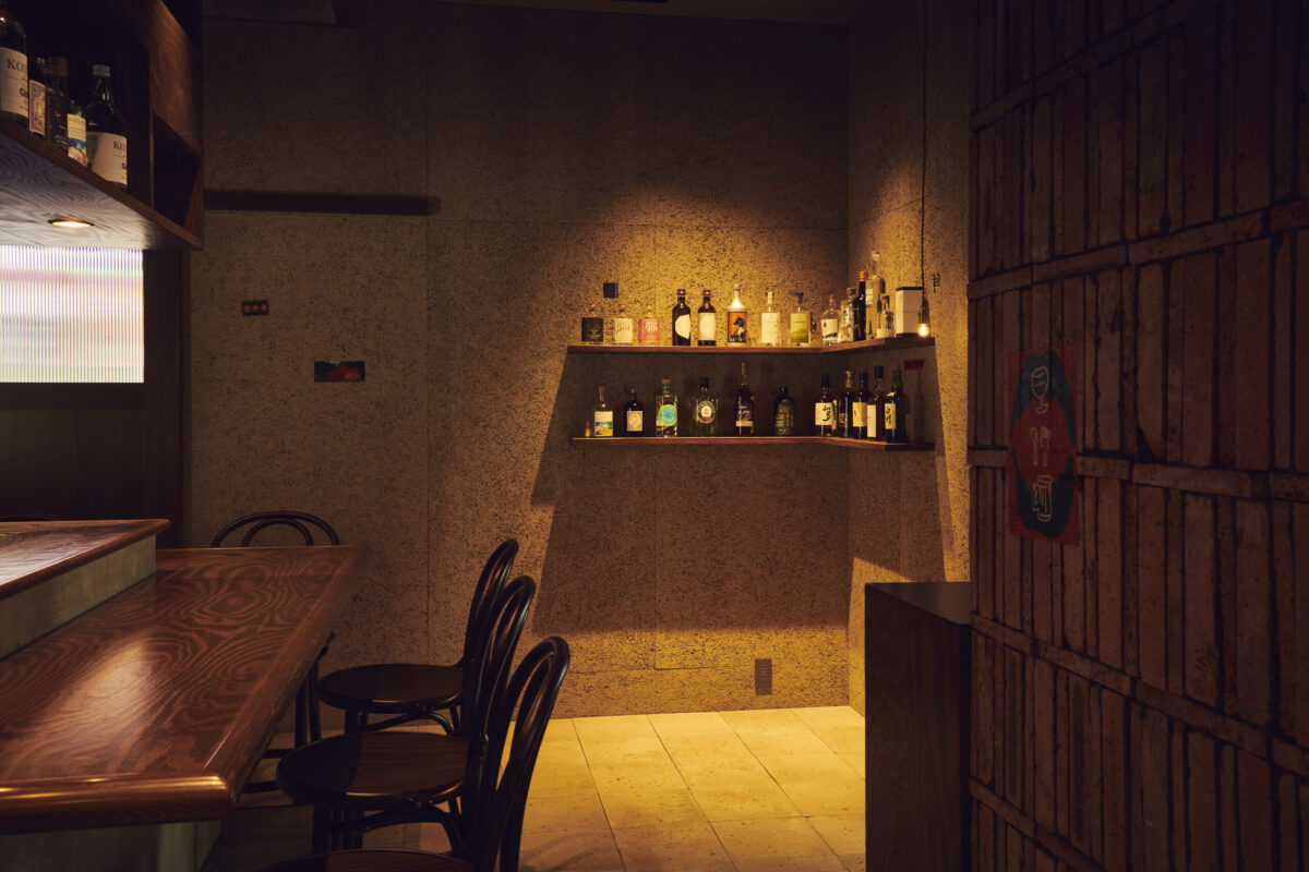 区画の一部をアーケード街の延長として考え、店舗の中に外壁を模した壁で仕切り擬似的に屋外空間を計画した。 照明の色味や照度も細かく分けることで、より違いを感じられるように演出。 店内窓面側は少し明るくワイワイと。カウンター側は少し暗めにして落ち着けるように。 屋外空間含め、シーンによって使い分けられるようなゾーニングと照明計画とした。 マテリアルは針葉樹合板や木毛板、古レンガや左官壁など表情のある材を中心に構成し、 使い込まれて汚れや傷が付き、時が経つにつれてさらに味わい深い空間になるようイメージしながら組み立てた。