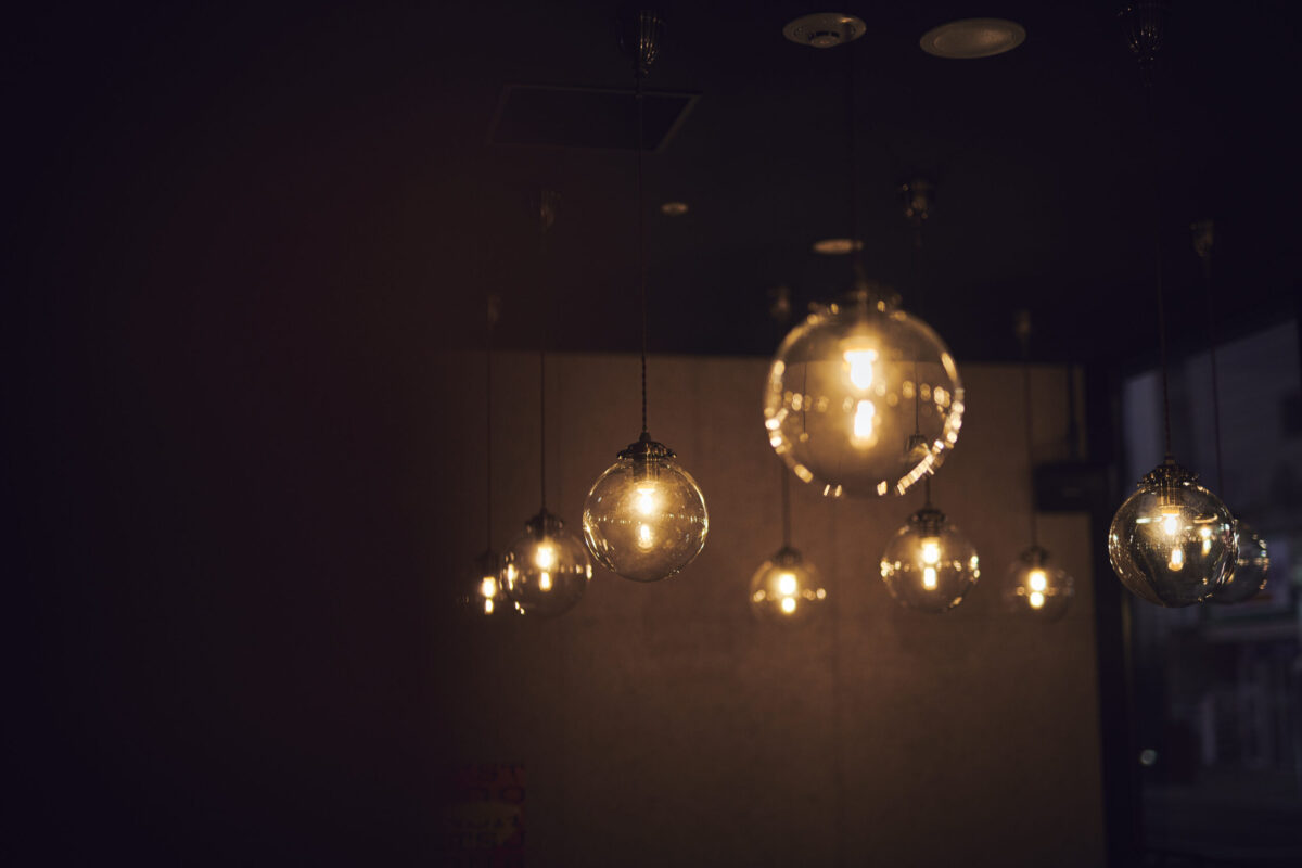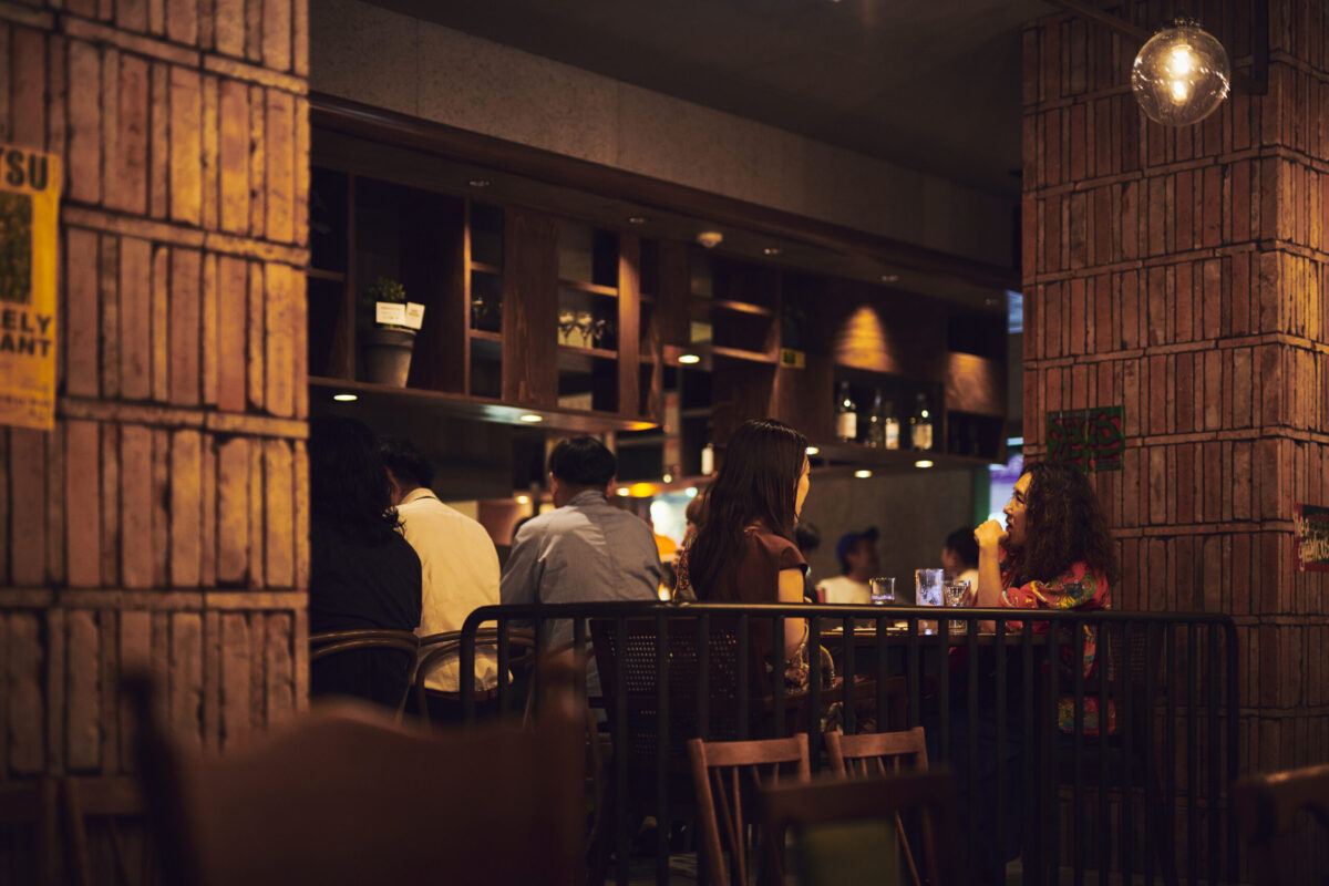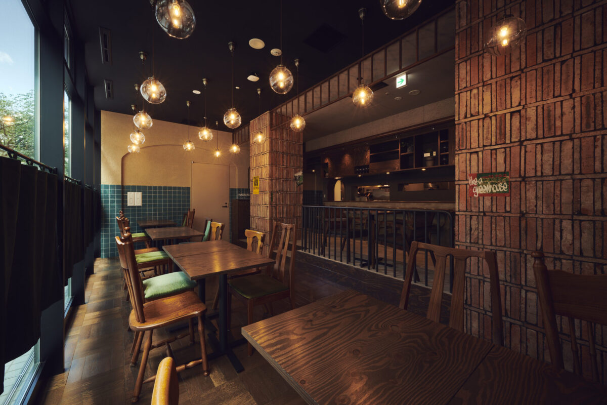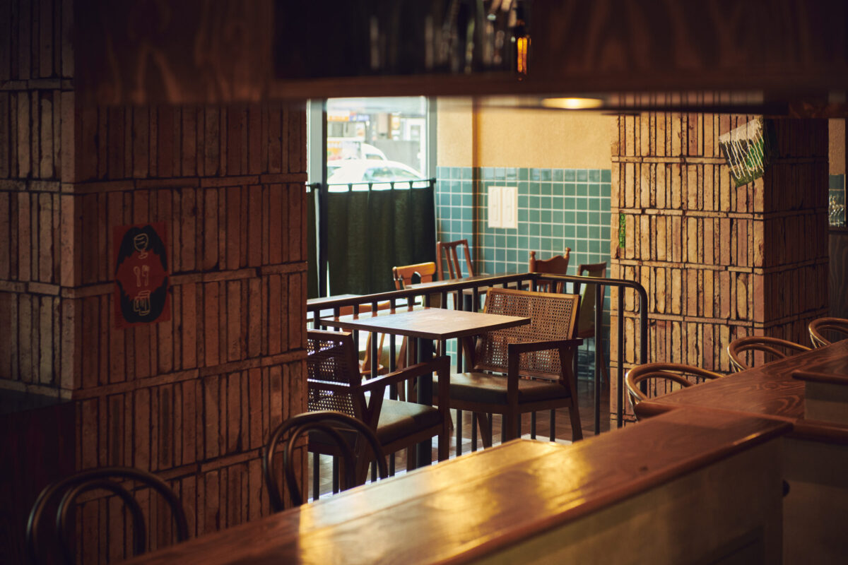 店内窓面側は少し明るくワイワイと。カウンター側は少し暗めにして落ち着けるように。