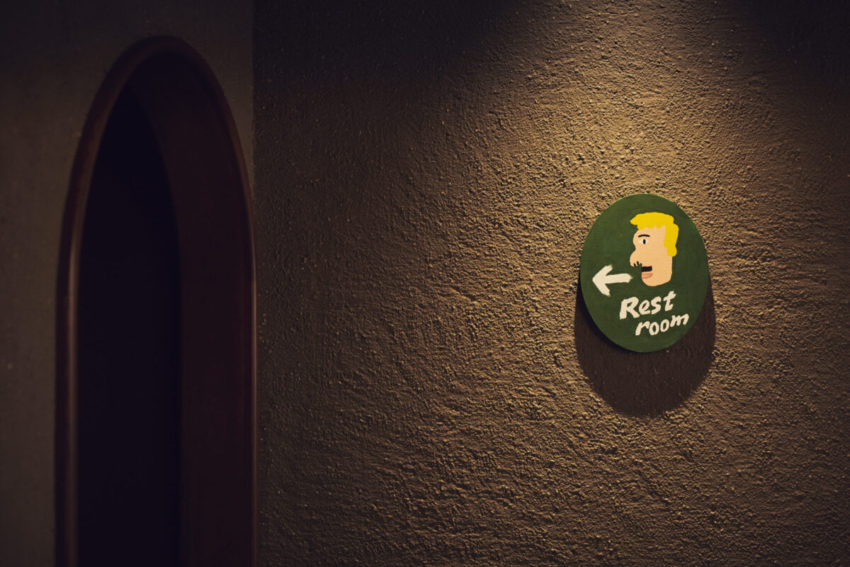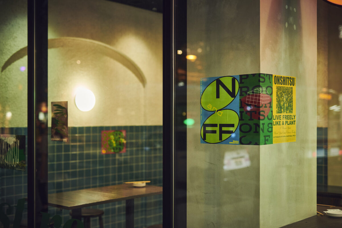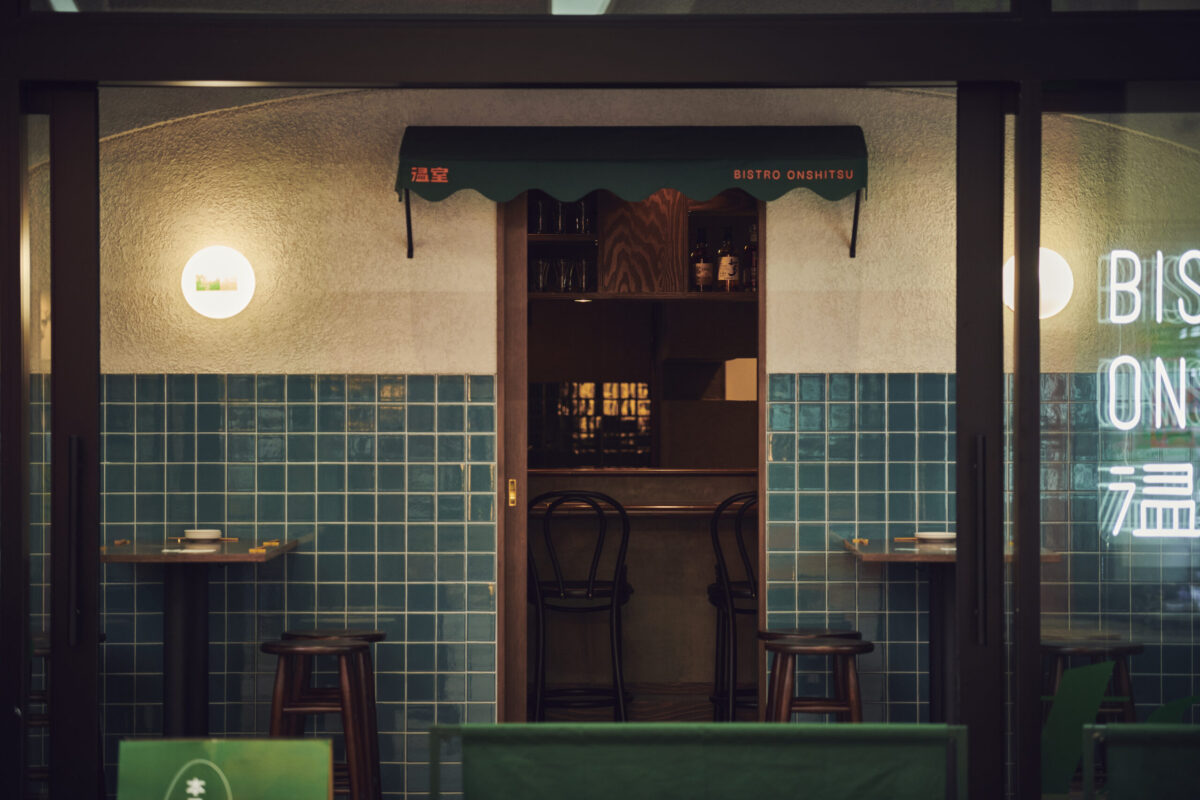夜も明るいアーケードからビストロ温室の存在感がわかるサインを計画。内装の雰囲気をあえて不協和音を醸し出し、入店時の感情をギャップを演出。他、店内や店外のグラフィックや