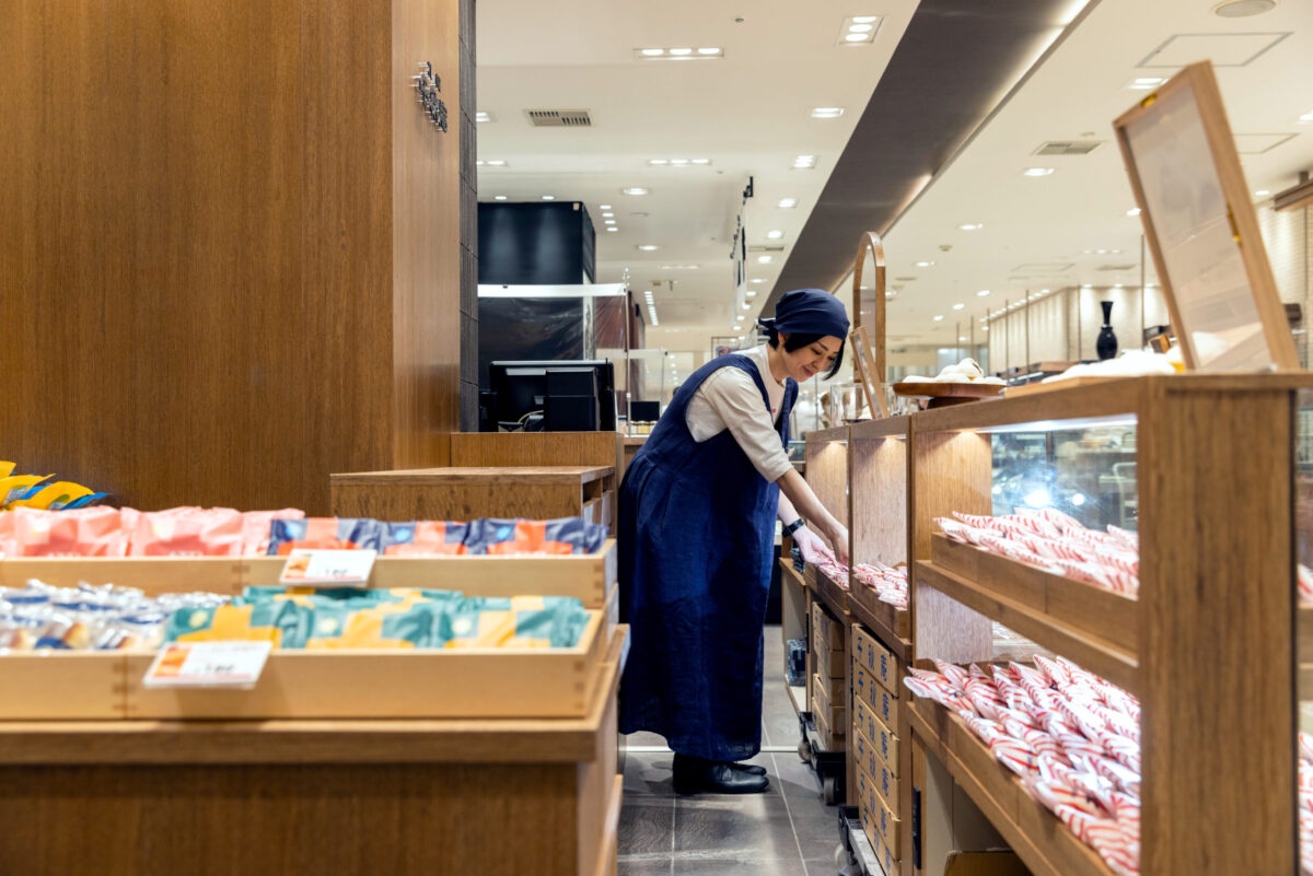 販売カウンターは昔ながらの対面販売の温かみを感じさせるオリジナルの木製什器をデザイン。大福をモチーフにした半円状のデザインにより、和の中にも現代的な洋を感じる雰囲気を感じる雰囲気を演出しています。また、「山親爺」や「ノースマン」など千秋庵を代表するお菓子も販売。 千秋庵が昔から街に灯してきたものづくりの気持ちと伝統を、空間とデザインに込めています。