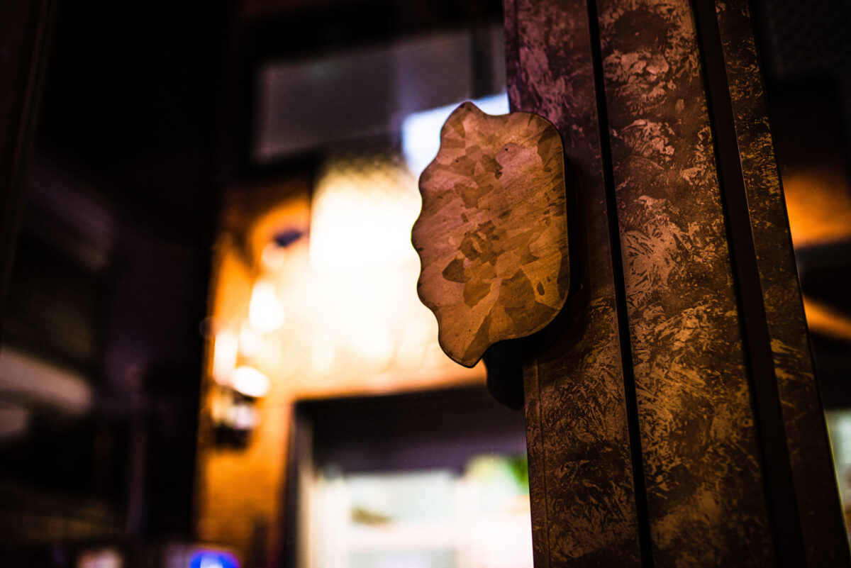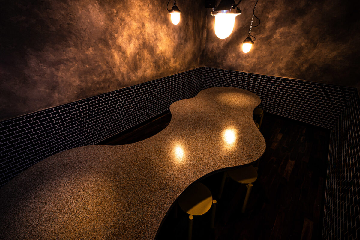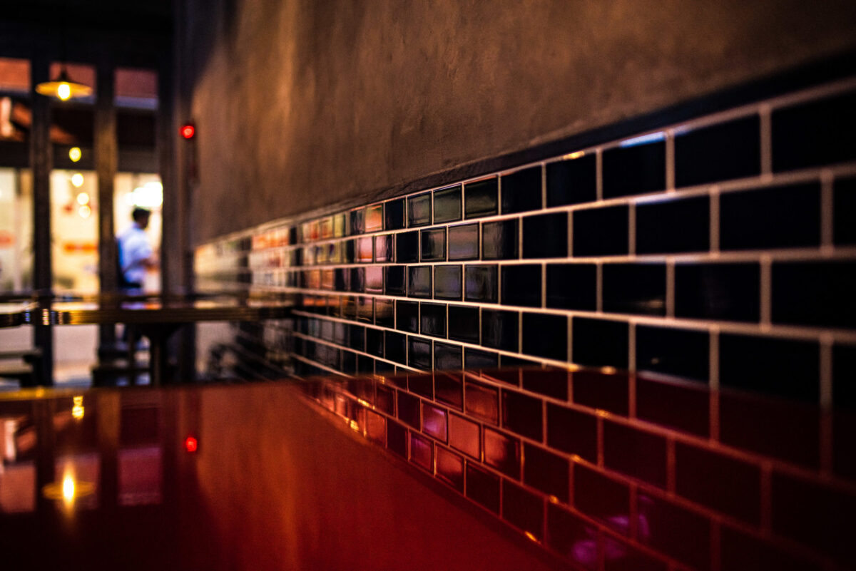 車が通れないような細い路地にたくさんのお店がひしめく天満エリア。 今回のお店の立地もメインの通りよりさらに奥まったところ。 区画も間口が狭く、奥に長い長方形。 この立地と形状を活かし、路地で食事しているような空間をイメージ。 店内を路地、壁を建物の外壁と見立て、 昔の建物に使われているような懐かしさを感じるタイルやエイジングされた壁をつくり 経年した雰囲気を。 路地(店内)を進んで扉を開けたら昭和のスナックにありそうな個室があったりと、 各所に違った表情を持たせることで路地感を演出。