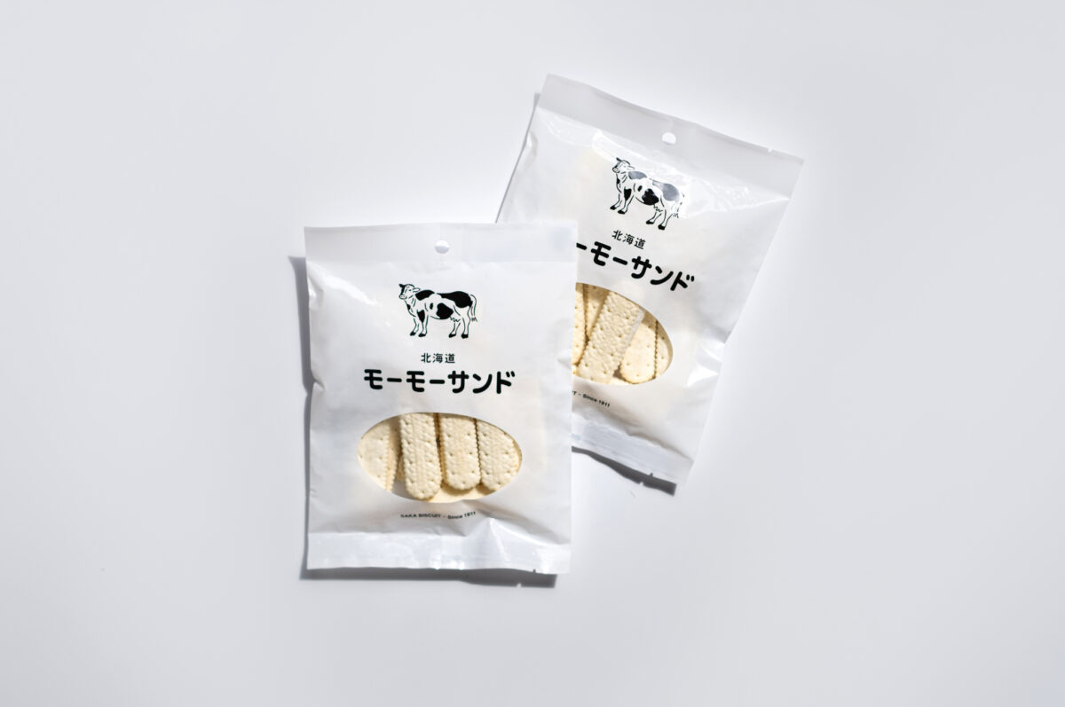 明治44年創業、坂ビスケット。 北海道で長年親しまれている同社のビスケットをベースに、より北海道らしさを味わえる商品をという思いから生まれた「モーモーサンド」。 坂ビスケットのロングセラー商品に続く新商品となるよう、デザインは飾らずどこか懐かしさを感じるシンプルな顔つきに。 売り場での一歩引いた佇まいと抜け感が目を惹き、さまざまな年齢層の人々が手に取りやすく、広く長く愛されるようデザインした。