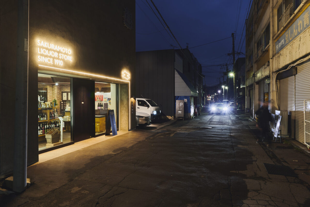 1910年創業の桜本商店。100年以上という歴史を持ち、地域に馴染んできた酒屋の顔つきのリデザイン。変化が無くても気づかれず、地域に馴染まない「浮き」はさらに良くない。以前は通りが商店街だったという地域が今後も廃れずあり続ける一助になるべくファサードを考察。新しい顔つきは、このタイミングで刷新した新しいロゴと共に昇華することでリブランディングへとつながっていく。当時、かなり尖っていたという先代の心を受け継ぎながら、4代目ならではのお店に進化させるべく前店舗のサインや店舗本体の仕上げ、意匠との馴染みをなど、息吹を残しながら現代へアップデートしました。薄暗かった通りはサインの照度により夜も明るくなり、電車通からも視認しやすくなった。店内も外から見えやすくなり以前に増して入りやすい雰囲気も醸造、地域とのコミュケーションもさらに盛り上がるように。