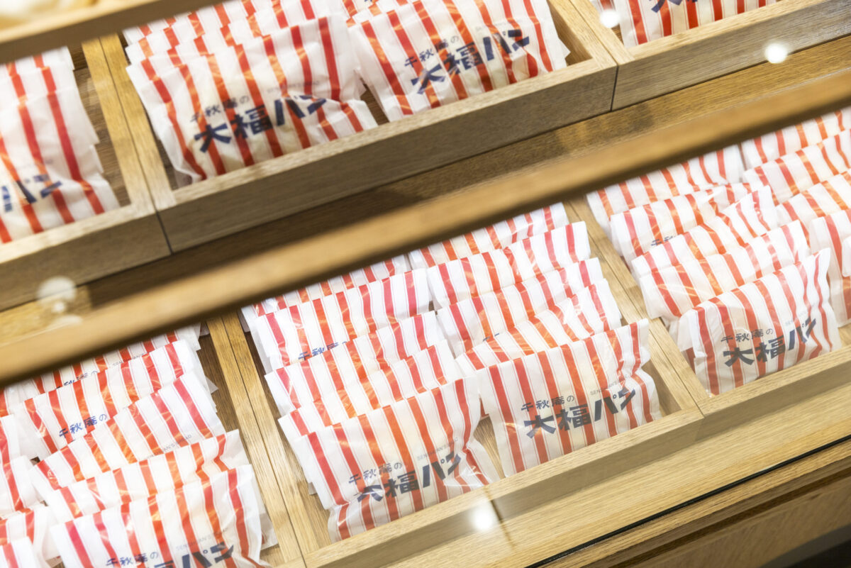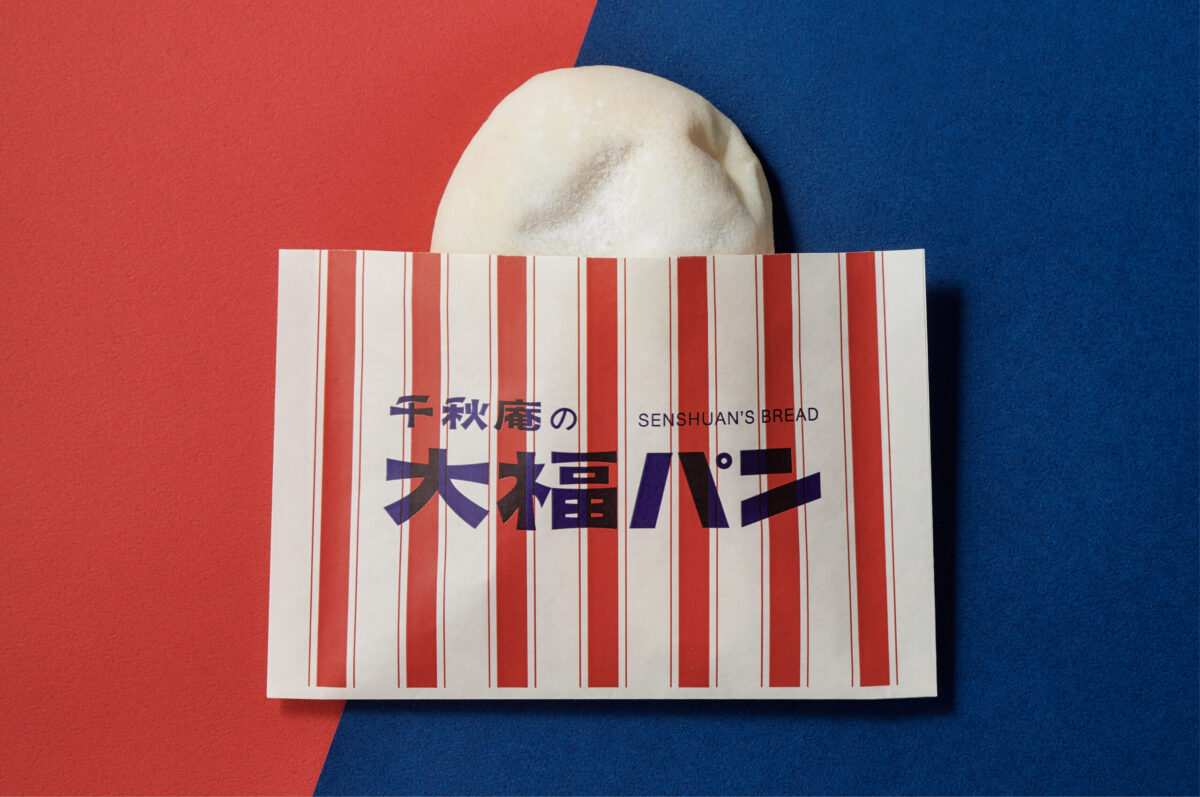 昭和40年代に販売していた「千秋庵のパン」のロゴを復刻し、新たに「千秋庵の大福パン」としてリデザインしました。