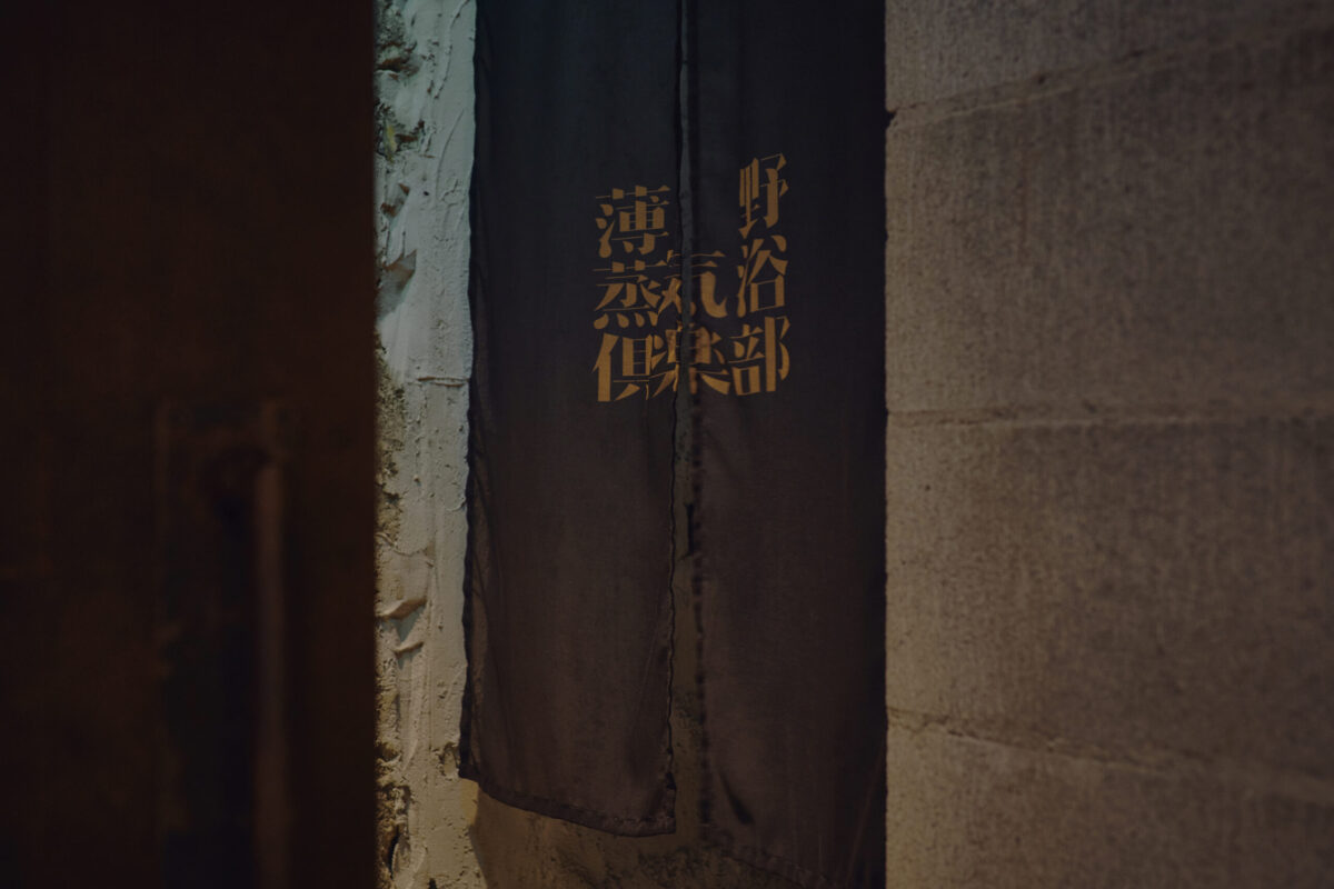 迎えるのは、サウナとは思えぬ古びた扉。錆び、歪み、蒸気で朽ちたスチールに、ただひとつ「蒸」のシンボルのみを配置。導線には、静かに揺れるいくつかの暖簾を設置。サウナスペースの入口には「薄野蒸気浴倶楽部」と記し、漢たちの凛とした緊張感と期待を宿した。