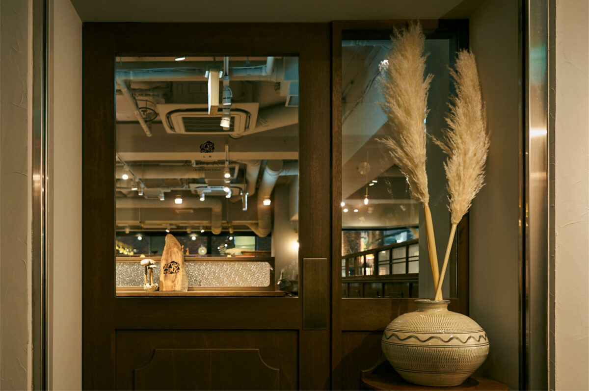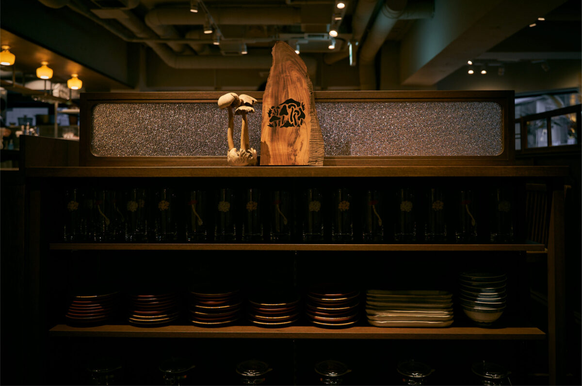 ブランドストーリーにもある「旅」をキーワードに、 「旅する中で集めた食器や花器、置物などを各所に散りばめ、 道中どこにでもあった鍋料理を食べながらその時の旅の記憶に思いを馳せる」 そんな情景を思い浮かべながら空間を組み立てていきました。 木の質感や陶器製のシェード、古い欄間や棚など、 温かみを感じられる構成としました。