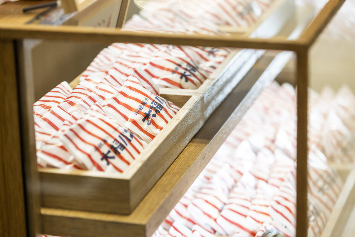 販売カウンターは昔ながらの対面販売の温かみを感じさせるオリジナルの木製什器をデザイン。大福をモチーフにした半円状のデザインにより、和の中にも現代的な洋を感じる雰囲気を感じる雰囲気を演出しています。また、「山親爺」や「ノースマン」など千秋庵を代表するお菓子も販売。 千秋庵が昔から街に灯してきたものづくりの気持ちと伝統を、空間とデザインに込めています。